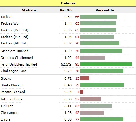 No es recuperador nato, ni roba mucho ni gana demasiados duelos. Tampoco es un cinco combativo. Cuando el equipo debe replegar y defender espacios amplios, sufre: llega tarde, comete falta o pierde el duelo, algo corregible pero dependiente del entorno.