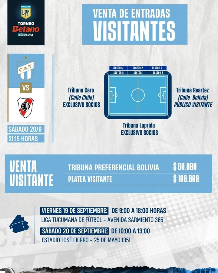 Para adquirir su entrada, los hinchas de River que quieran estar presentes en el Fierro deberán acercarse el viernes, entre las 9:00 y las 18:00 horas, a la sede de la Liga Tucumana de Fútbol, o el mismo sábado, entre las 10:00 y las 13:00, a las boleterías del estadio.