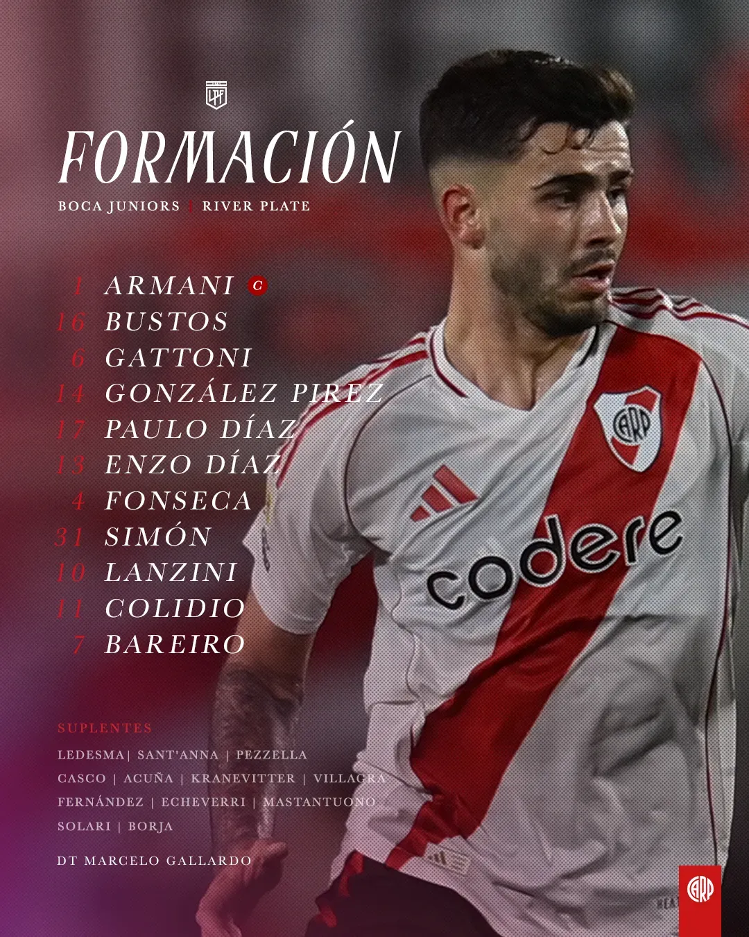 Marcelo Gallardo confirmó a los titulares para el Superclásico de esta tarde: Franco Armani; Fabricio Bustos, Leandro González Pirez, Paulo Díaz, Federico Gattoni, Enzo Díaz; Santiago Simón, Nicolás Fonseca, Manuel Lanzini; Adam Bareiro y Facundo Colidio.