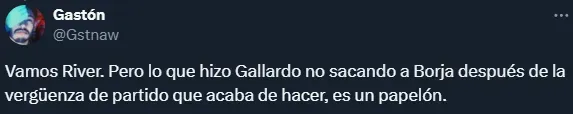 Tras esas primeras palabras sobre Borja, Gallardo volvió a ser consultado sobre el rendimiento del colombiano, aunque esta vez con un tono más crítico. “Si de sus cinco situaciones hubiera concretado, no me estarías diciendo lo que estás diciendo. Es una condición de meterla o no meterla. El análisis que yo debo hacer es otro”, respondió el DT con un semblante más serio.