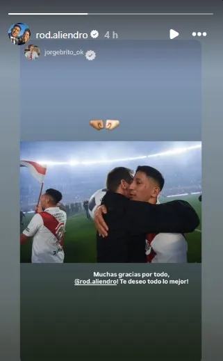 El presidente de River compartió, mediante una historia de Instagram, una imagen con Aliendro, acompañada de un mensaje de despedida. “Muchas gracias por todo. Te deseo todo lo mejor”, escribió el mandamás. Rodrigo compartió el posteo y le agregó dos emojis de manos, que juntas hacían un choque de puños.