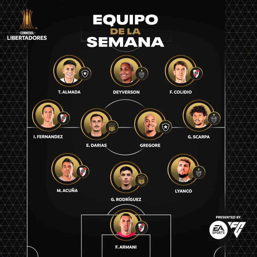 Finalmente, el último jugador que aparece es Facundo Colidio. Coronando una semana realmente espectacular, el delantero fue elegido como uno de los mejores de los cuartos de final tras su gol a Colo Colo. De ser suplente a romperla en el Superclásico y en la Copa Libertadores.