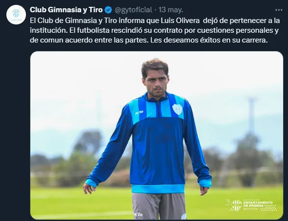 El lateral izquierdo, surgido en el Millonario y que supo jugar un Superclásico y una final de Copa Argentina como titular allá por 2016, disputó 9 partidos en el actual campeonato y se desvinculó en las últimas horas: “El Club de Gimnasia y Tiro informa que Luis Olivera dejó de pertenecer a la institución. El futbolista rescindió su contrato por cuestiones personales y de común acuerdo entre las partes. Les deseamos éxitos en su carrera“, informó el club el pasado 13 de mayo.