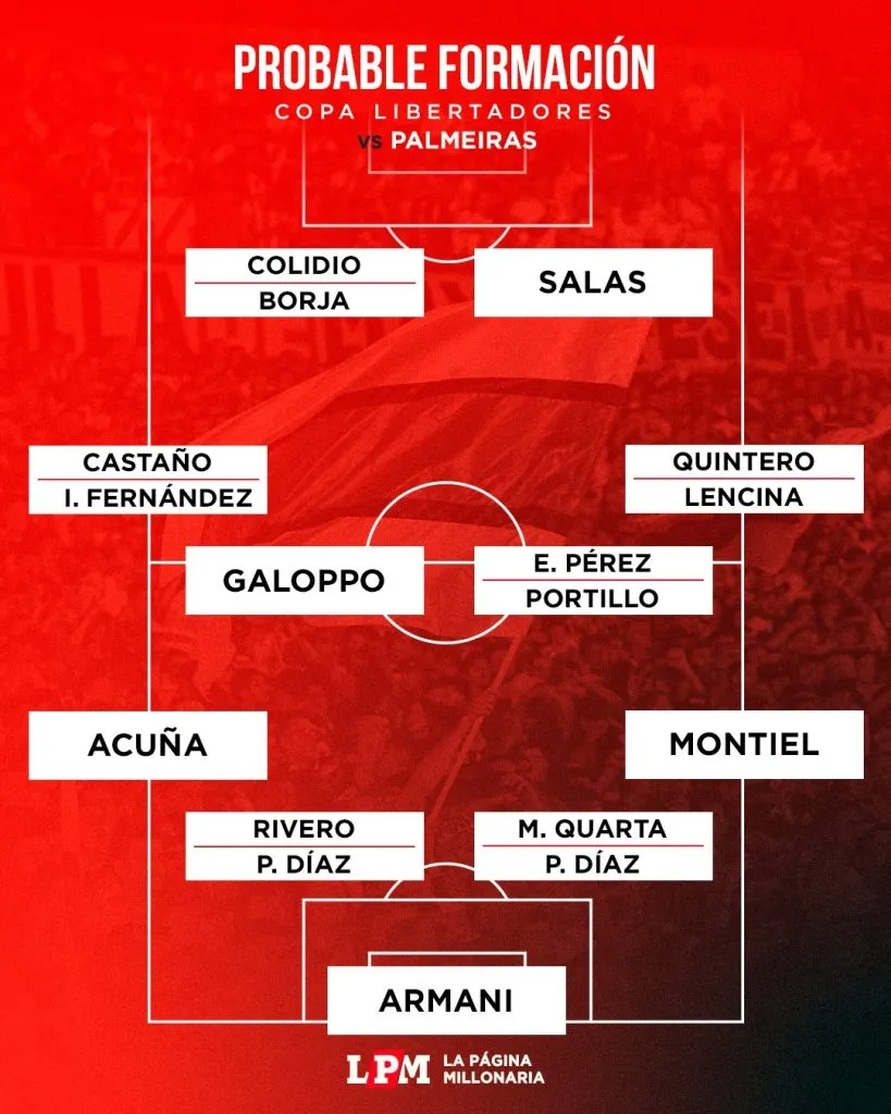 Después de un olvidable partido en la ida en el Monumental, sumado a que Lucas Martínez Quarta fue determinante tras su ingreso, Paulo Díaz hizo méritos suficientes para salir del once vs. Palmeiras y dejarle su lugar a Lautaro Rivero. Un jugador que viene creciendo tanto en protagonismo como en rendimiento, igualmente el Muñeco podría apostar por la dupla más experimentada de MQ-Díaz.
