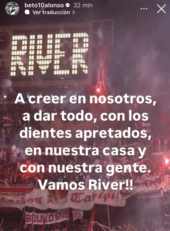 Mediante una historia en su Instagram personal, el Beto Alonso publicó una imagen de un antiguo recibimiento en el Estadio Monumental y su mensaje pensando en el partido del martes: “A creer en nosotros. A dar todo, con los dientes apretados, en nuestra casa y con nuestra gente. Vamos River”.