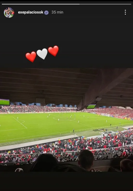 Al igual que el volante, el Diablito también estuvo presente en la tribuna. Echeverri también hizo pública su presencia en Núñez con una publicación en Instagram. De hecho, su foto fue de una ubicación muy similar a la de Palacios, por lo que se interpreta que estuvieron prácticamente juntos viendo el partido.
