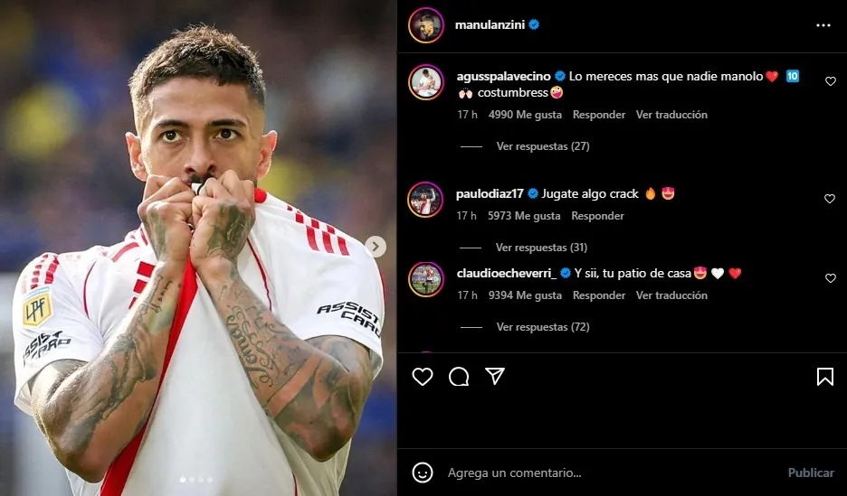 Además del Diablito, aparecieron varios comentarios de exjugadores de River o de compañeros que tuvo Lanzini en su carrera felicitándolo por la tarea que tuvo en el Superclásico que se llevó River. Paulo Díaz, Agustín Palavecino o Erik Lamela son algunos de los que estuvieron.