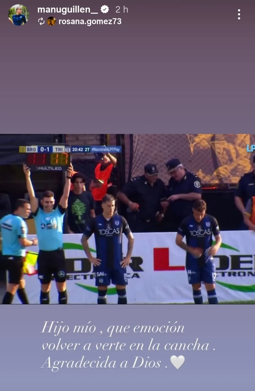 Afortunadamente, el nacido en Florida, Buenos Aires, pudo volver a jugar este fin de semana, cuando ingresó al minuto 21 del segundo tiempo en la victoria del Lechero por 1-0 como visitante de Almirante Brown por la fecha 7 de la Primera Nacional, segunda categoría del fútbol argentino. Su regreso fue celebrado con un sentido posteo de su madre en redes sociales. “Hijo mío, que emoción volver a verte en la cancha. Agradecida a Díos”, reza el mensaje que fue compartido por Guillén en su cuenta personal de Instagram.