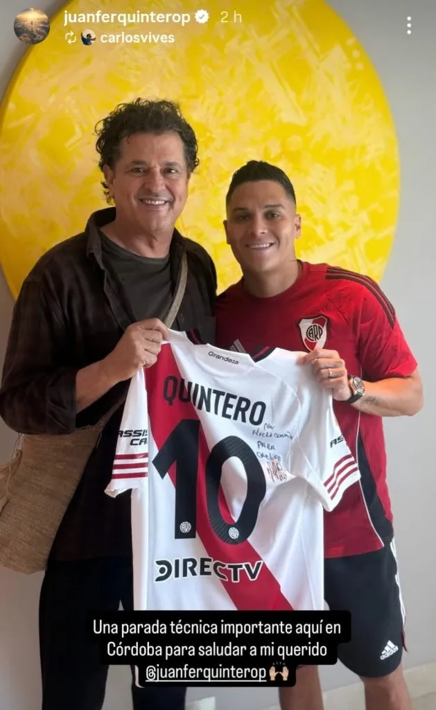 “Una parada técnica aquí en Córdoba para saludar a mi querido Juanfer Quintero”, escribió el nacido en Santa Marta en una historia de Instagram que luego compartió el futbolista millonario.