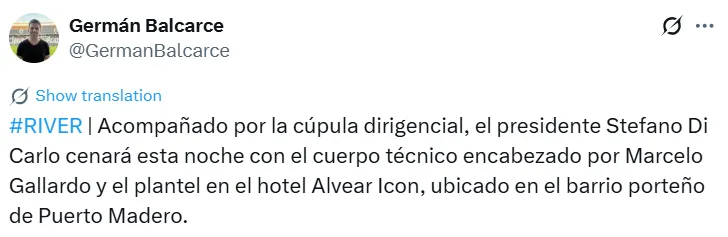 Según informó el periodista Germán Balcarce, el mandamás de la institución cenó junto con Gallardo y el resto de los jugadores. Esta no es la primera vez que Di Carlo se reúne con ambas partes, ya que lo hizo día después de ser electo al presentarse en un entrenamiento que se estaba llevando a cabo en el River Camp.