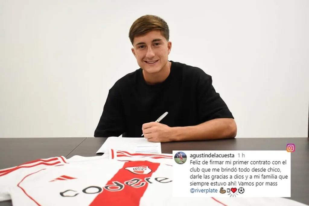 De la Cuesta firmó su primer vínculo profesional con el Millonario antes del partido con Godoy Cruz hasta el 31 de diciembre de 2028 y no ocultó su felicidad en redes sociales: “Feliz de firmar mi primer contrato con el club que me brindó todo desde chico“, soltó en las últimas horas.