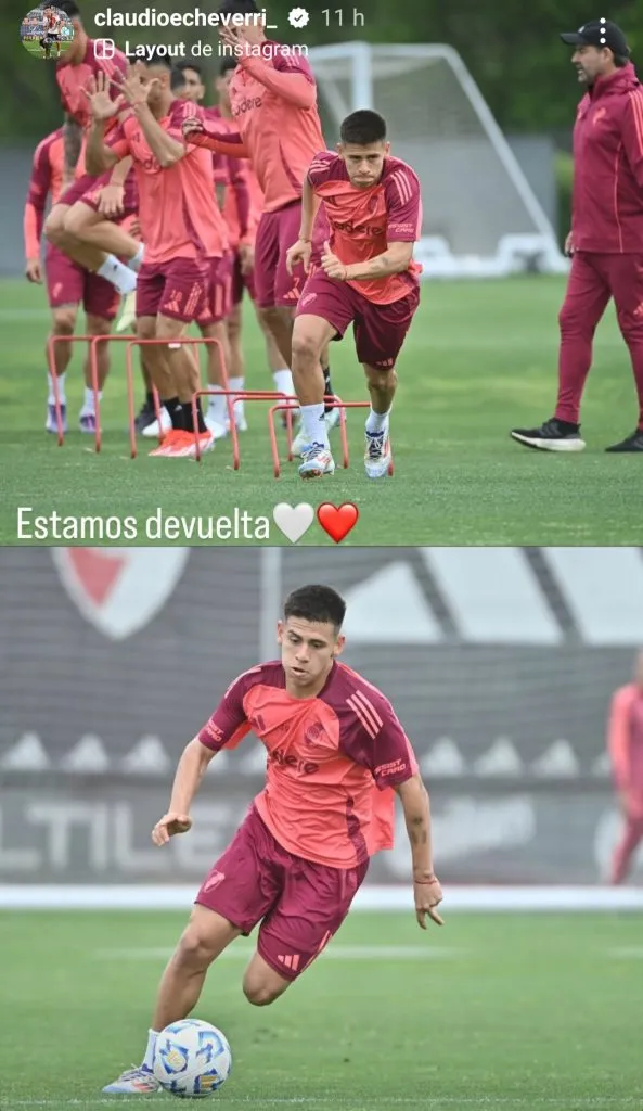 En las últimas horas Echeverri utilizó su cuenta de Instagram para subir dos fotos del entrenamiento del lunes en el River Camp, y puso el mensaje “estamos de vuelta”, agregando un corazón blanco y otro rojo. El Diablito sabe que vive sus últimos meses con la camiseta del Millonario antes de su arribo a Europa, y quiere estar 100% comprometido con la causa.