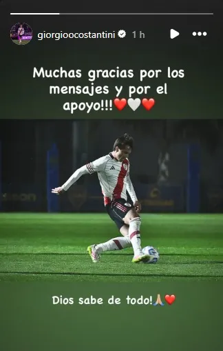 Los mensajes de apoyo no tardaron en llegar. Jugadores, hinchas y hasta el propio club le dieron ánimo al volante tras confirmarse la grave lesión. “Fuerza y pronta recuperación, Giorgio”, escribieron desde las redes oficiales de River. Este domingo, el futbolista de 19 años dejó un mensaje de agradecimiento.