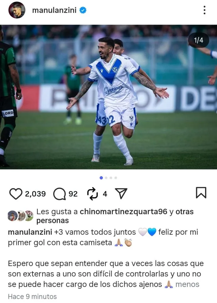 Manuel Lanzini convirtió su primer gol en Vélez ante San Martín de San Juan por el Torneo Clausura 2025. En su tercera titularidad, el ex River la rompió en el triunfo del Fortín, y luego del partido su padre apuntó contra Marcelo Gallardo. Eso generó revuelo en Núñez y el propio futbolista salió a responder.