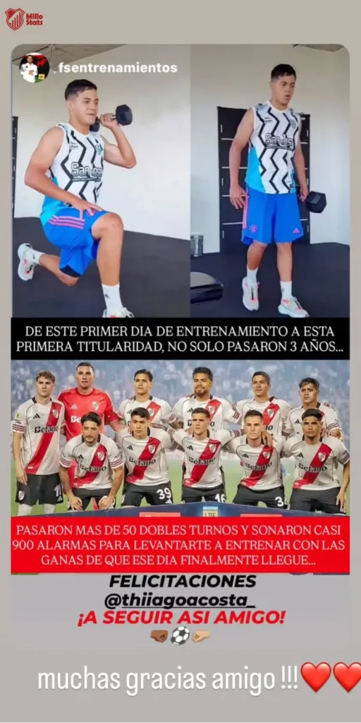 En su cuenta de Instagram, el preparador físico Fernando Silvero, quien trabaja con varios jugadores del club, tanto de Primera como de inferiores, le dejó un mensaje a Acosta. “Pasaron más de 50 dobles turnos y sonaron casi 900 alarmas para levantarte a entregar con las ganas de que ese día finalmente llegue. Felicitaciones Thiago, a seguir así amigo”, escribió.