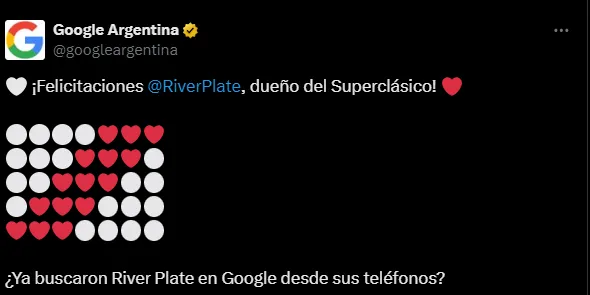 En un saludo un tanto particular que no se había dado anteriormente, Google le mandó un mensaje a River desde su cuenta en Argentina: “¡Felicitaciones River Plate, dueño del Superclásico!“, escribió el perfil junto a varios corazones y emojis blancos que forman la bandera del Más Grande.