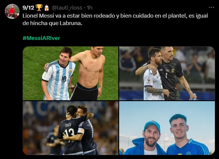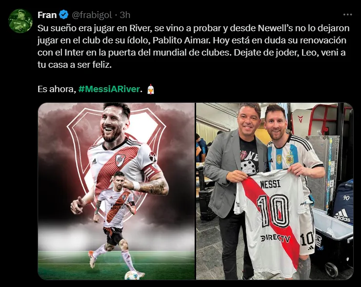Bajo el hashtag “#MessiARiver”, los hinchas del Más Grande comenzaron a publicar imágenes editadas con la camiseta del CARP, así como también momentos en los que sostuvo el manto sagrado y momentos relacionados a la institución y a parte de los jugadores del plantel actual. Un comienzo de semana esperanzador para algunos.
