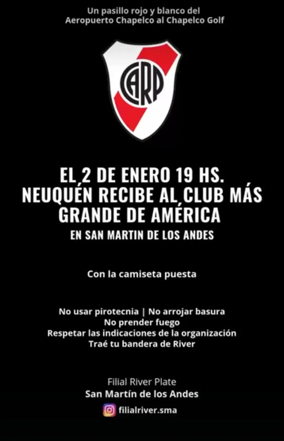 Tal como sucedió en 2020, 2022 y 2025, la filial del Millonario en San Martín de los Andes anunció que realizará un multitudinario banderazo para darle la bienvenida al equipo. “El 2 de enero a las 19 horas, Neuquén recibe al Más Grande de América”, se indica a través de un video en el que se pueden observar imágenes de anteriores recibimientos.