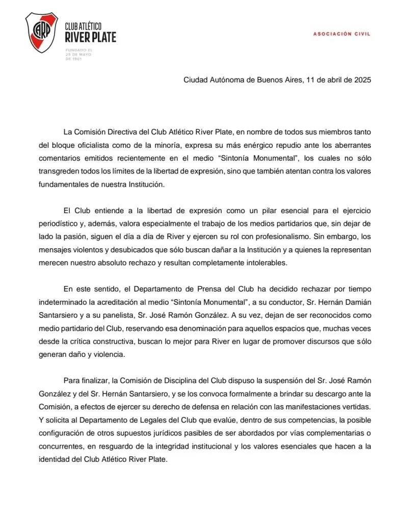 El comunicado oficial de River