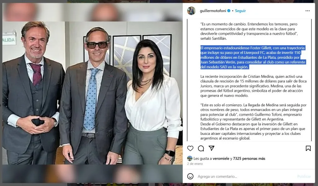 El pasado 2 de enero, Guillermo Tofoni celebró la llegada de Foster Gillett. Lo hizo a través de un comunicado en sus redes sociales:
