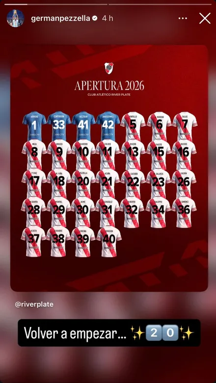 En vísperas del debut oficial, River confirmó los dorsales del plantel para el 2026. En vistas a la nueva temporada, varios jugadores del plantel decidieron cambiar el número que portarán en su camiseta. Uno de ellos es Germán Pezzella, quien abandonó el N°6 y pasará a usar el N°20. Tras la confirmación, el defensor explicó el motivo.