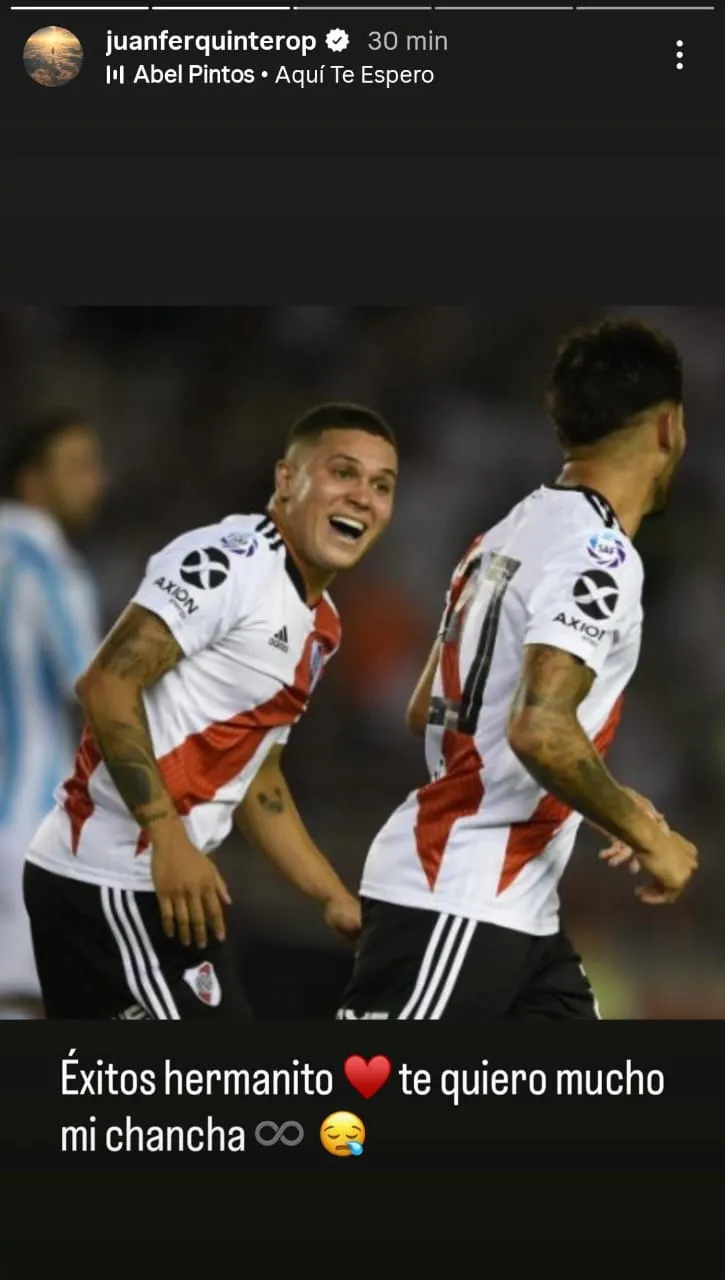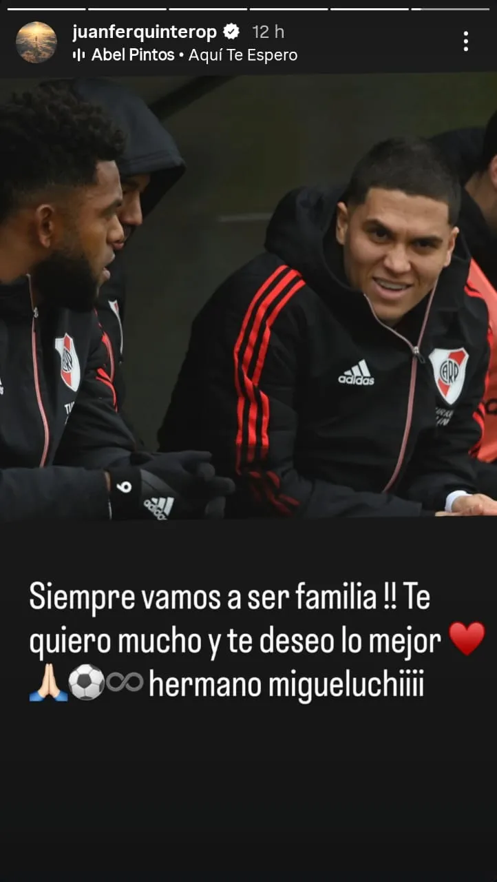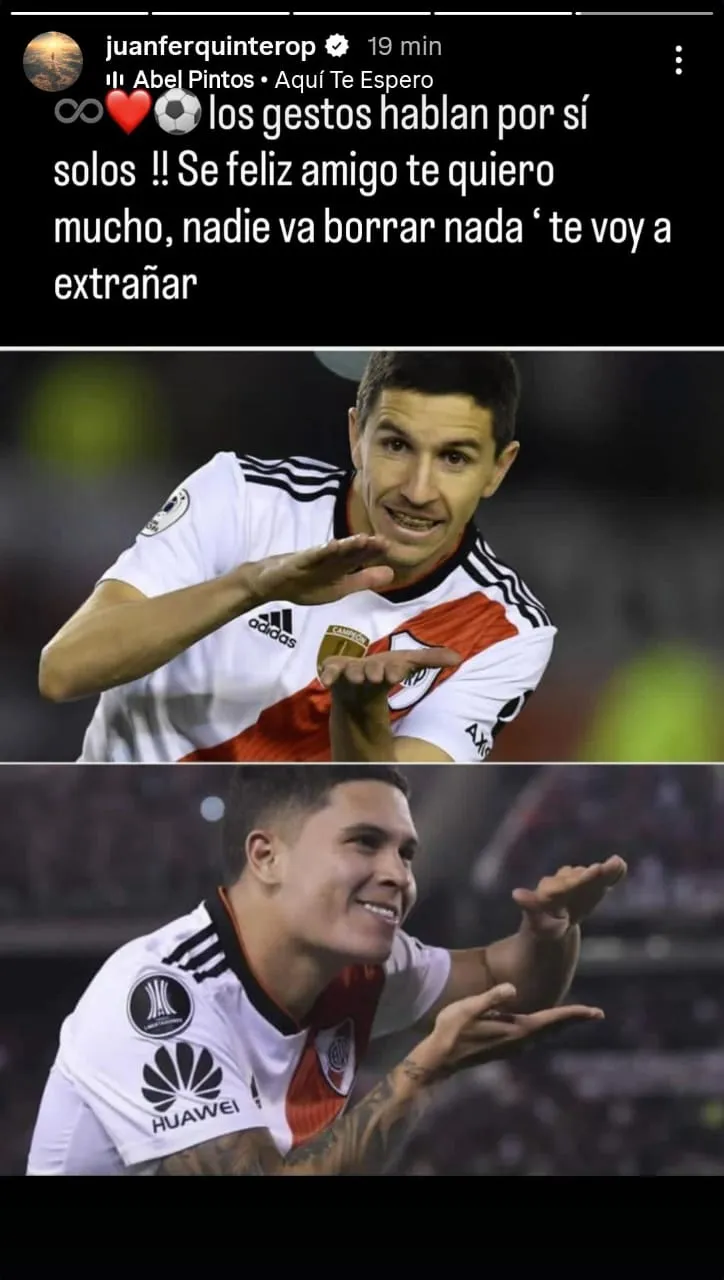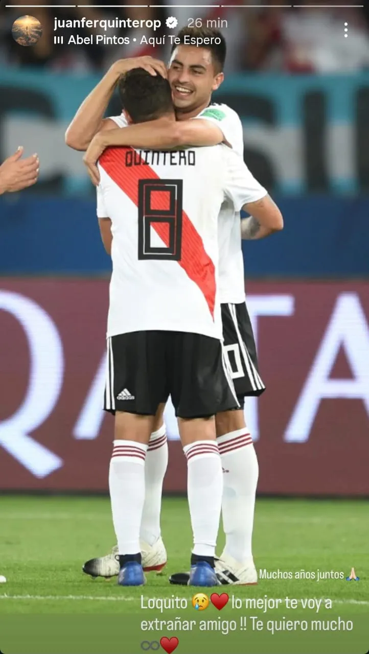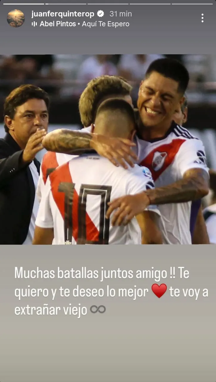 Quintero le dedico una historia a cada uno, con la canción “Aquí te espero” de Abel Pintos, junto a emojis de un corazón, el signo infinito y de caras tristes. La primera fue para el mediocampista y capitán: “Muchas batallas juntos, amigo. Te quiero y te deseo lo mejor, te voy a extrañar, viejo”.