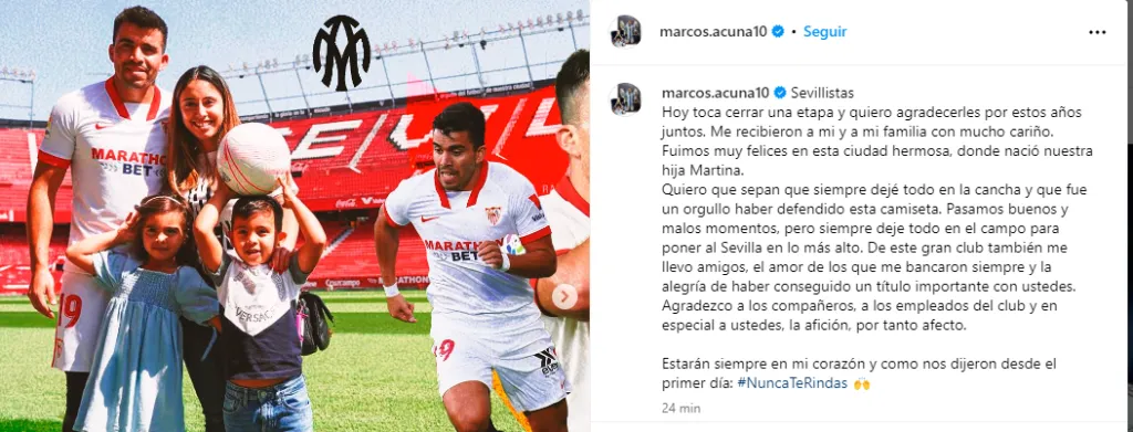 “Sevillistas. Hoy toca cerrar una etapa y quiero agradecerles por estos años juntos. Me recibieron a mi y a mi familia con mucho cariño. Fuimos muy felices en esta ciudad hermosa, donde nació nuestra hija Martina.