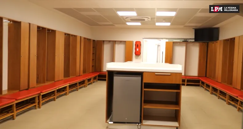 Quedó casi idéntico al vestuario local, con todas las comodidades. Hay un sector especial para cuerpos técnicos, otro para que los jugadores se cambien, espacio para realizar movimientos pre-competitivos, zona de jacuzzi y demás.