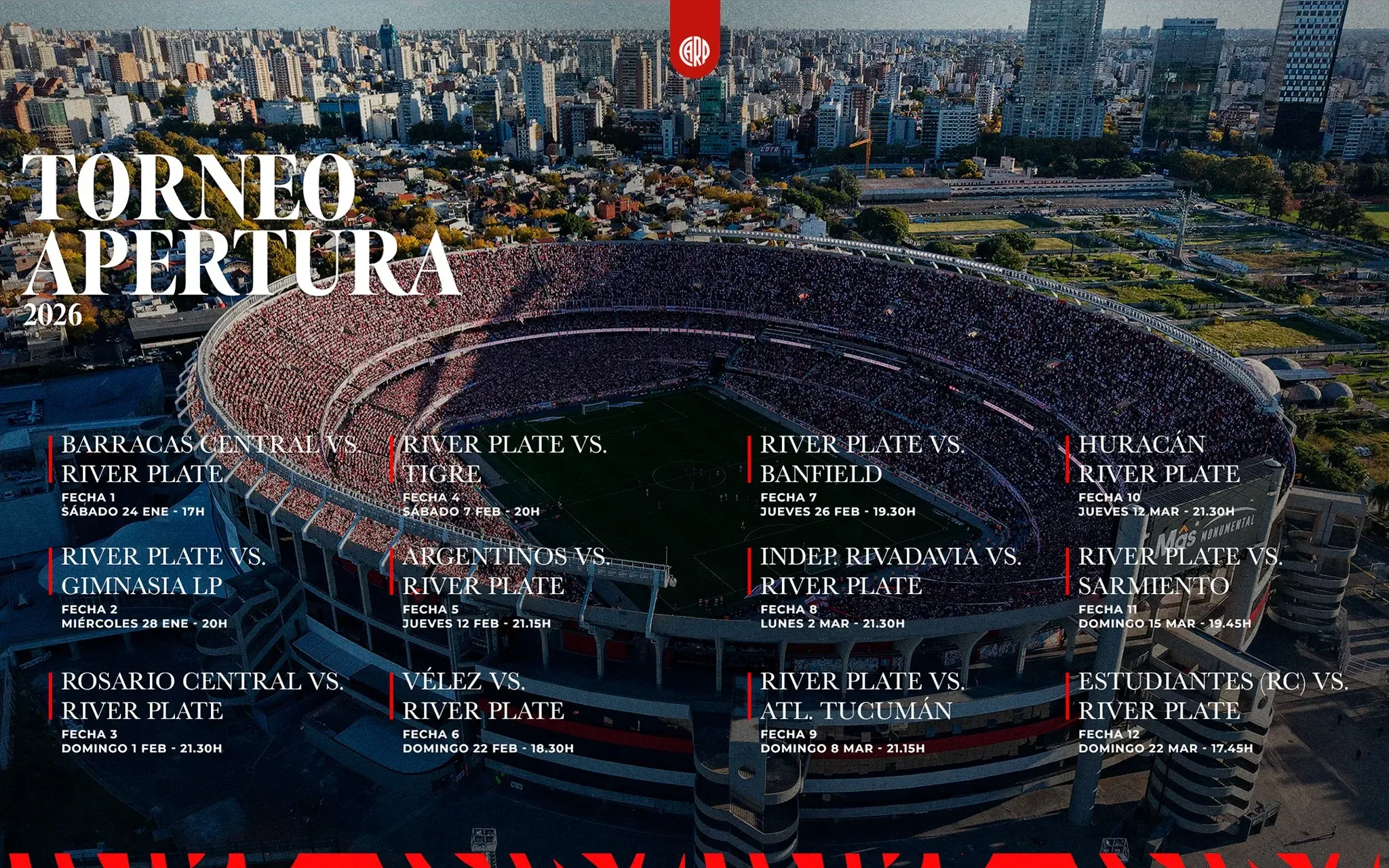 River ya conoce su cronograma para las primeras 12 fechas del Torneo Apertura 2026. Este lunes, la Liga Profesional dio a conocer el fixture de una parte de la fase regular perteneciente al torneo que comenzará el jueves 22 de enero y que se extenderá durante el primer semestre del año.