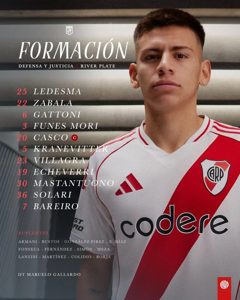 Jeremías Ledesma; Daniel Zabala, Federico Gattoni, Ramiro Funes Mori, Milton Casco; Rodrigo Villagra, Matías Kranevitter; Pablo Solari, Franco Mastantuono, Claudio Echeverri; Adam Bareiro, el equipo plagado de suplentes que eligió Gallardo para jugar esta noche en Florencio Varela. Once cambios, incluído el arquero, con respecto a la derrota en Brasil.