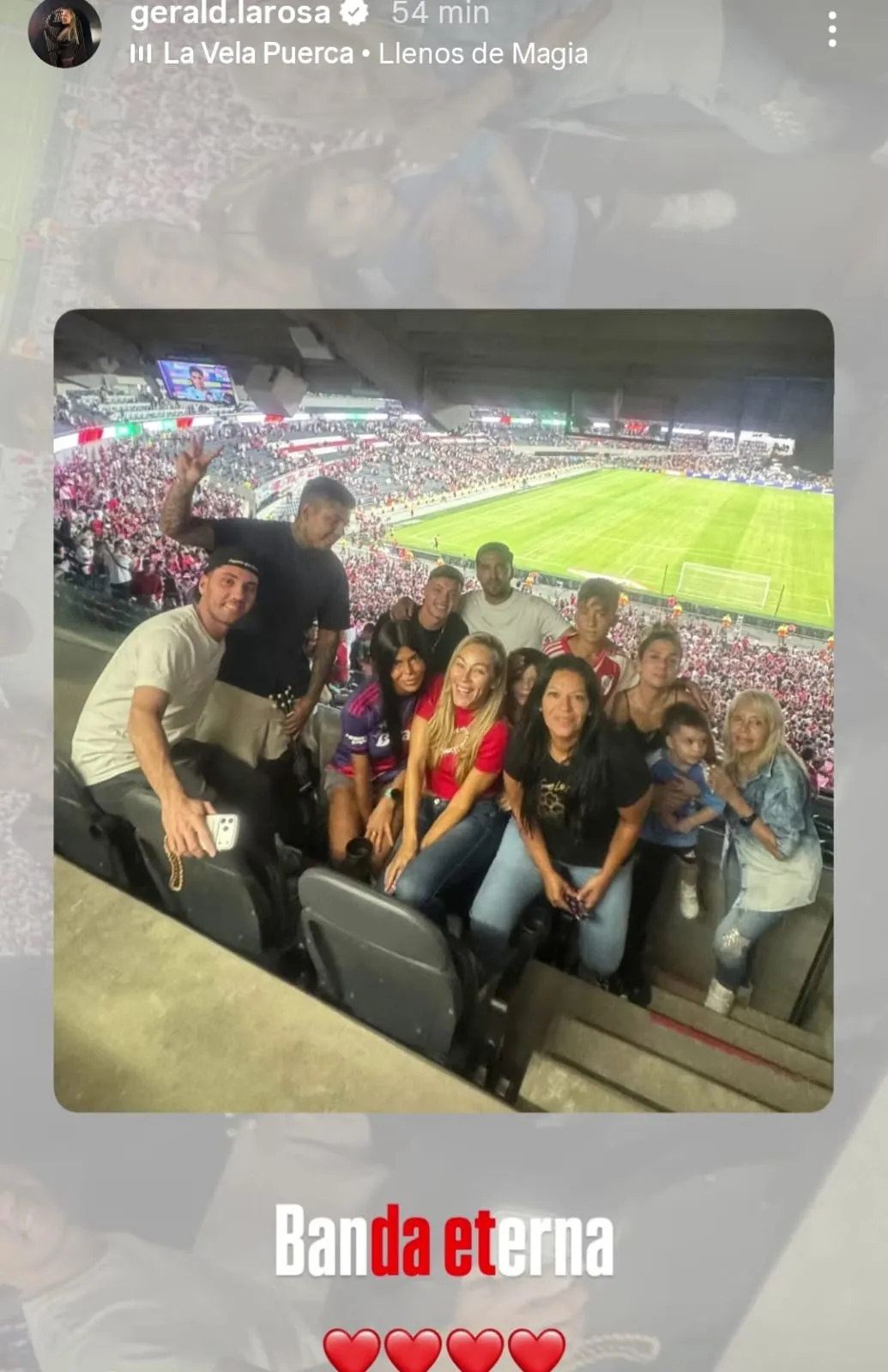 Por un lado, la pareja del Muñeco se mostró junto a Benjamín, el menor de los cuatro hijos que tuvo con Gallardo, en una de las tribunas del Monumental junto a una frase que decía: “Por este amor”. Luego, publicó otra historia junto a amigos en su cuenta personal de Instagram a la que le escribió “banda eterna” y le agregó cuatro emojis de corazón.