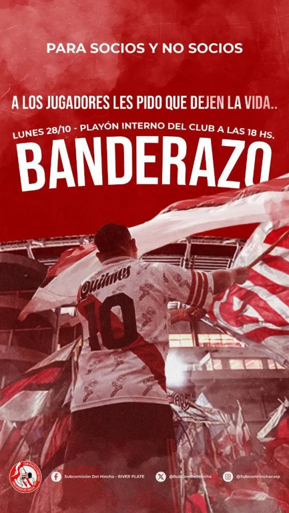 El mismo, organizado por la Subcomisión del Hincha de River, se llevará a cabo este lunes 28 de octubre, en el playón interno del club, al cual se accede por Avenida Figueroa Alcorta. Comenzará a las 18 y tanto como socios como no socios podrán asistir.