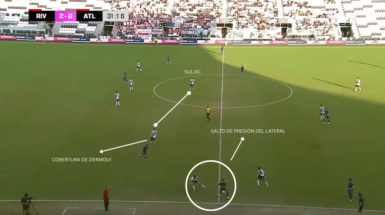 La base del mediocampo es fundamental. No solo inicia la construcción, sino que aporta despliegue e inicia transiciones. Ziermoly tiene un rango de pase muy bueno y siempre es opción en la salida; Suljic es el segundo volante y aporta mucho más sin pelota.