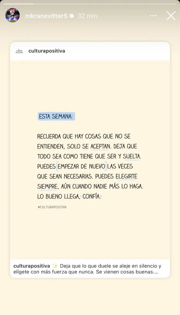 La decisión del entrenador golpeó fuerte al mediocampista, ya que su intención era permanecer en el club, al menos, hasta fin de año. Sntimiento que el propio jugador expresó en redes sociales con un mensaje cargado de resignación: “Recuerda que hay cosas que no se entienden, solo se aceptan. Deja que todo sea como tiene que ser y suelta”, escribió en una historia de Instagram.