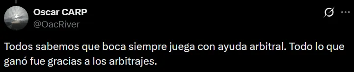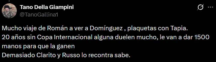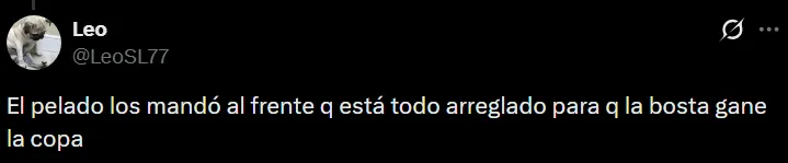 Acto seguido, y si bien dejó en claro que “no voy a entrar en detalles” continuó: “Boca tiene una necesidad imperiosa de ganar la Copa y yo no quiero jugar contra ellos”. Anteriormente, Russo había deslizado que “los equipos grandes son favorecidos por los árbitros”. A raíz de estas palabras, los hinchas de River rápidamente comenzaron a presuponer una eventual ayuda al Xeneize.