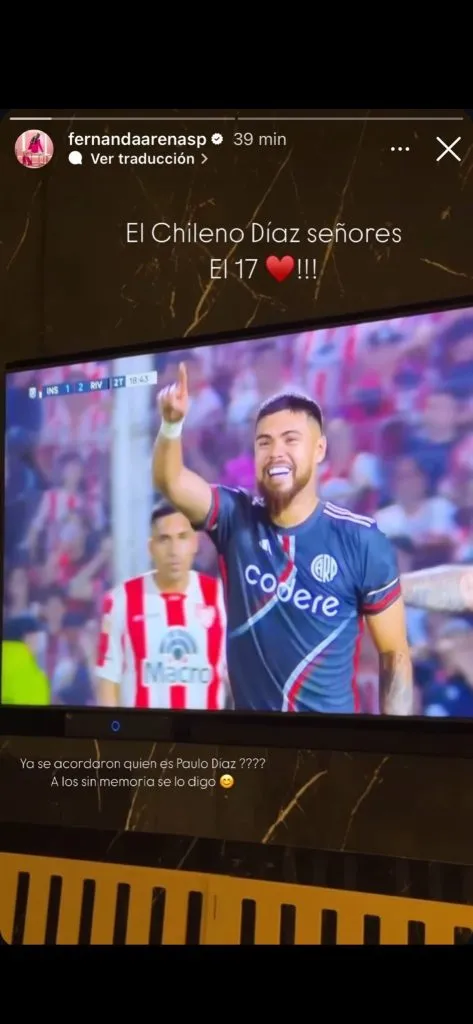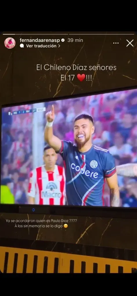 Fue el gol número 10 para Paulo Díaz en 180 partidos con la camiseta de River. Pero lo que se volvió viral no fue su festejo sino la publicación que realizó su pareja Fernanda Arenas en Instagram: “Ya se acordaron de quién es Paulo Díaz???? A los sin memoria se los digo“, cuestionando seguramente a las personas que venían criticando al zaguero chileno.