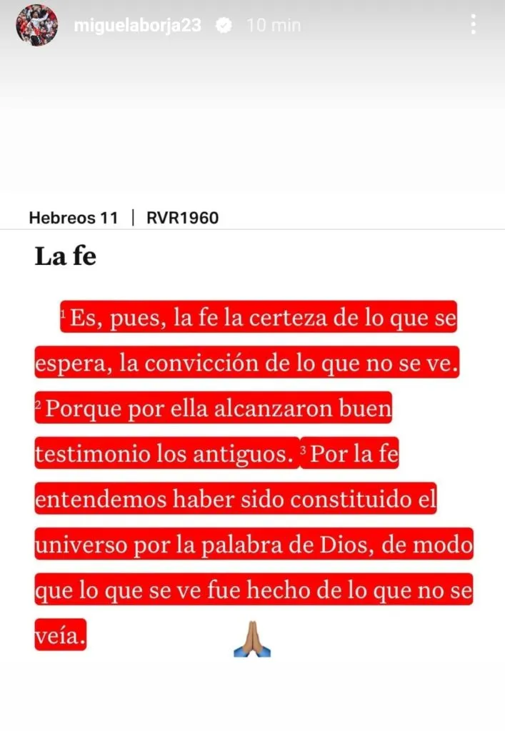 A horas de un partido que puede ser histórico, el delantero colombiano, que ayer estuvo cantando junto al resto de sus compañeros a la par de los hinchas en el banderazo, realizó una publicación en su cuenta de Instagram. “La fe”, el versículo de la Biblia que eligió el atacante para manifestarse.