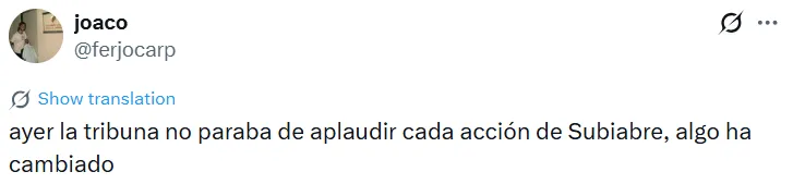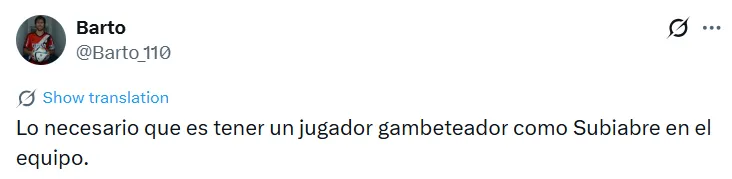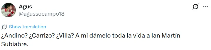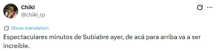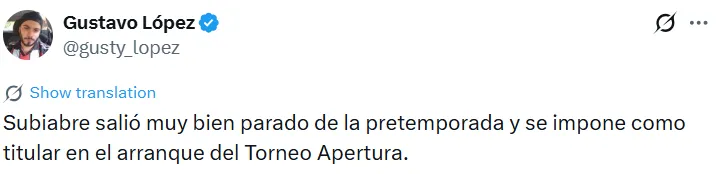 La buena actuación de Subiabre ante Peñarol fue reconocida no solo por la organización del partido, que lo eligió como la figura, sino también por los hinchas. Estos se deshicieron en elogios para con el nacido en Comodoro Rivadavia a través de las redes sociales.