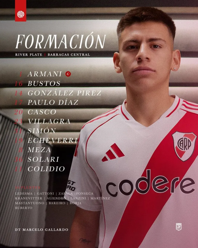 Franco Armani; Fabricio Bustos, Leandro González Pírez, Paulo Díaz y Milton Casco; Santiago Simón, Rodrigo Villagra, Maximiliano Meza; Claudio Echeverri; Pablo Solari y Facundo Colidio, los once elegidos por el Míster para jugar frente a Barracas desde las 17.15.