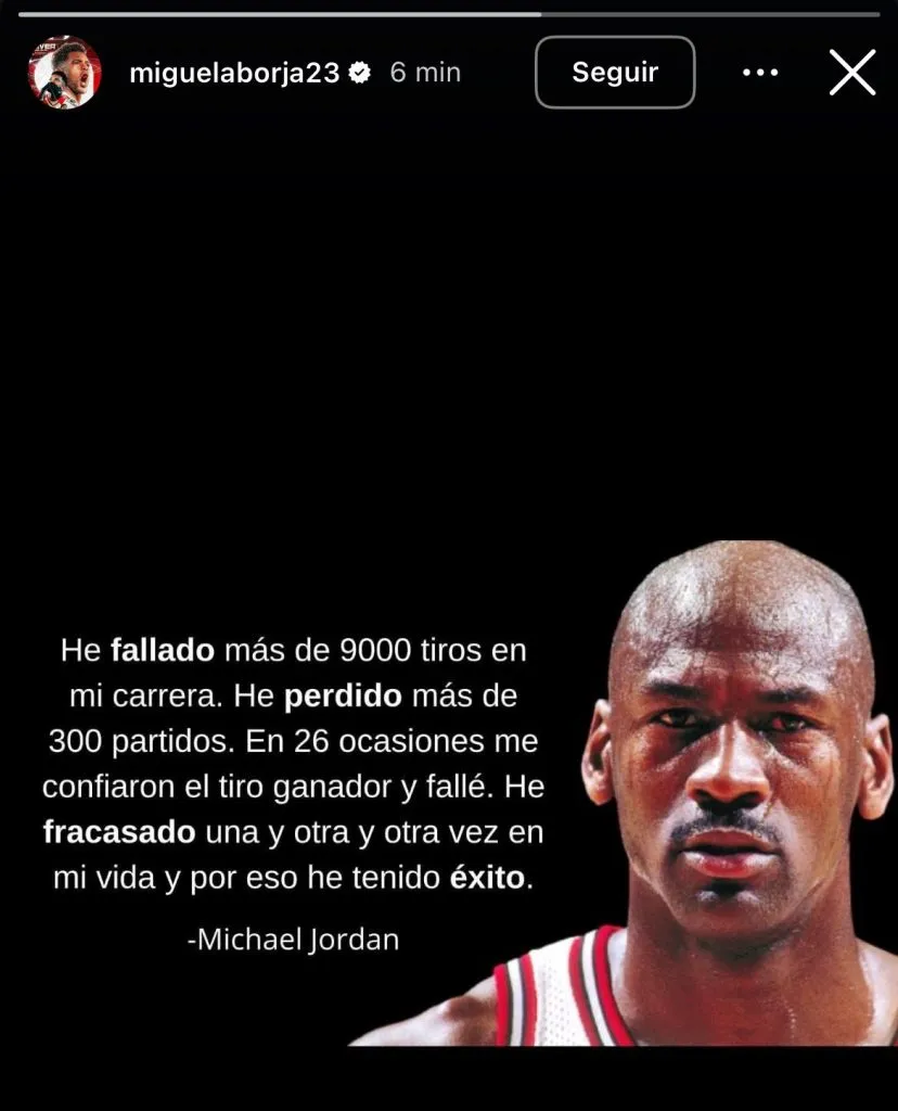 Parafraseando a una de las leyendas más grandes del deporte mundial, Borja eligió una vieja declaración de Michael Jordan para graficar su momento: “He fallado una y otra y otra vez en mi vida, y por eso he triunfado”.