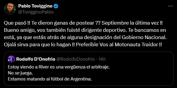 Ante esto, Toviggino no tardó mucho en expresarse en su cuenta de X y, citando a D’Onofrio, con una insólita respuesta: “Bueno amigo, vos también fuisté dirigente deportivo. Te bancamos en está, ya que estás atrás de alguna designación del Gobierno Nacional“, escribió con el simple sentido de atacar.