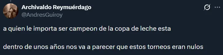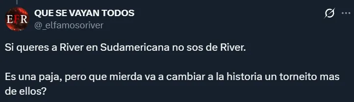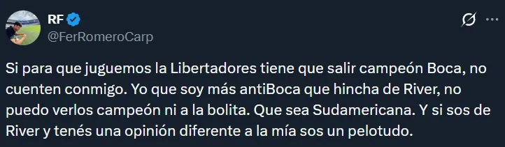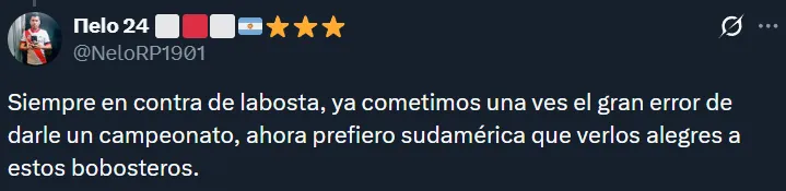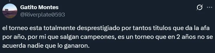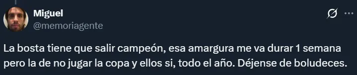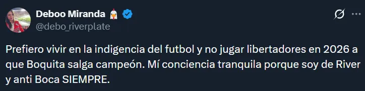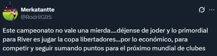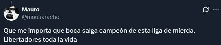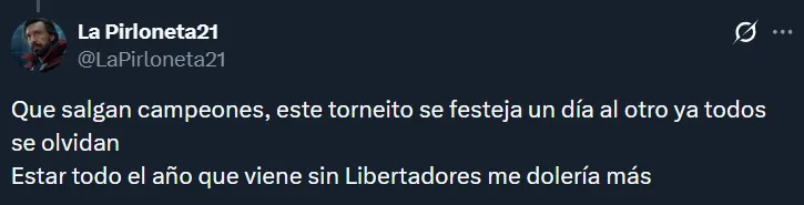 Por supuesto, tampoco faltaron los hinchas que dejaron en claro que no les importaría que Boca gane el Torneo Clausura siempre y cuando ello signifique que River juegue la próxima Libertadores. En muchos casos, los riverplatenses argumentaron que el campeonato argentino no tiene el mismo valor que una liga de las de antes.