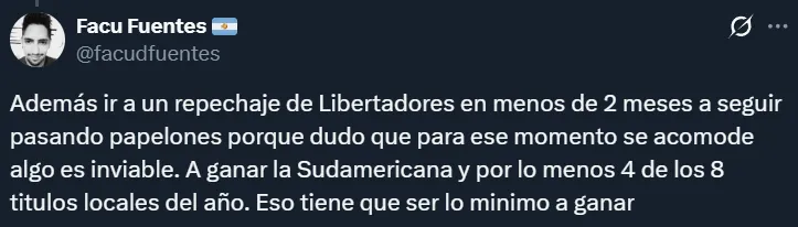 En las redes sociales se abrió el debate y los hinchas no tardaron en manifestar sus preferencias. Si bien hubo cierta división, en líneas generales se impuso la idea de que Boca no salga campeón y River juegue la Copa Sudamericana con el argumento, lógicamente, de no querer que el eterno rival levante el trofeo por más que ello represente no jugar la próxima Libertadores.