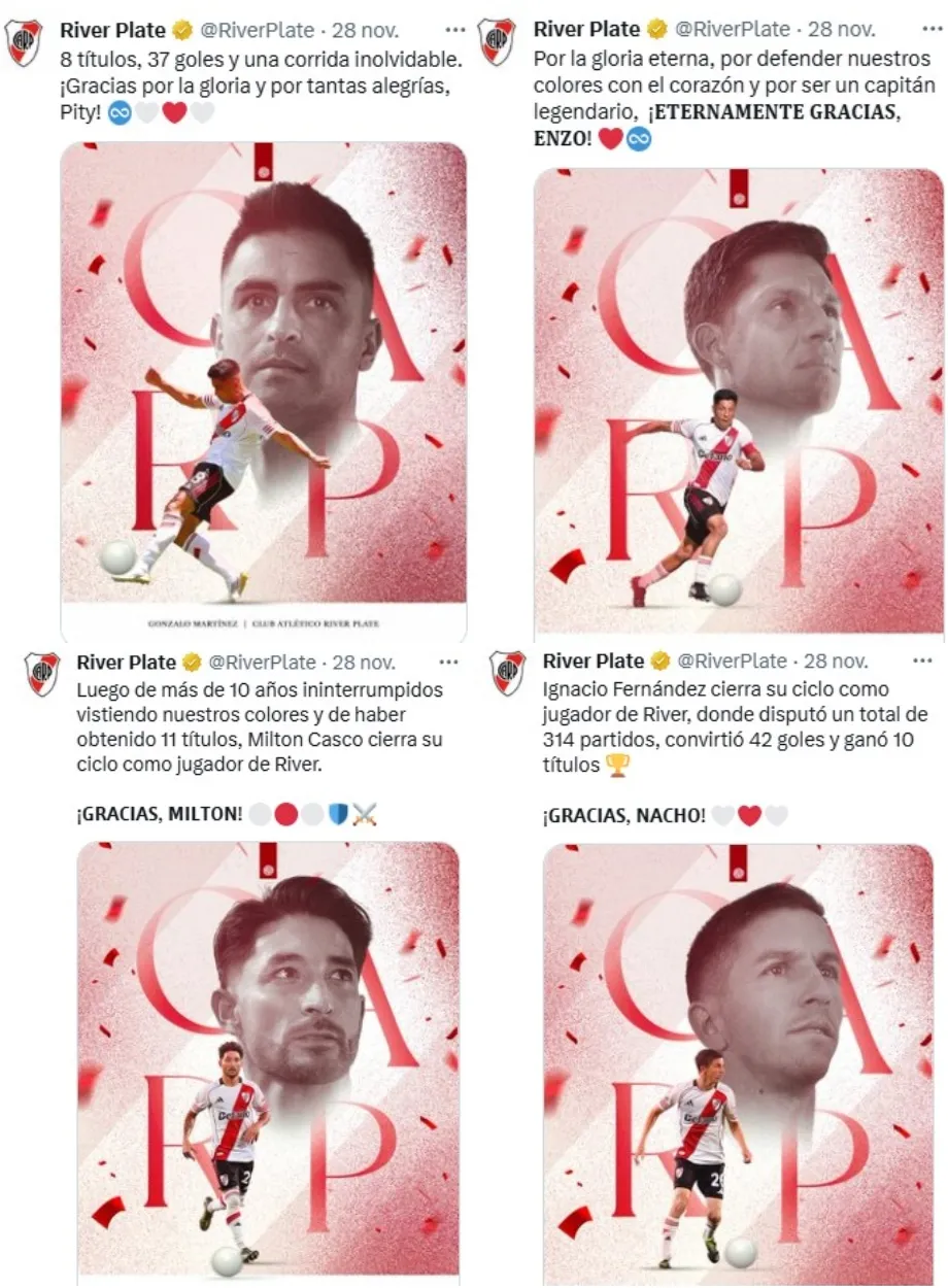 En medio de un clima difícil de digerir por los resultados se dio la decisión de Marcelo Gallardo de prescindir de Enzo Pérez, Ignacio Fernández, Milton Casco y Gonzalo Martínez, en el marco de un año donde salvo contadas excepciones no tuvieron protagonismo futbolístico y donde la gente los despidió con mucho afecto y nostalgia por todo lo que significarán en la historia grande del club.