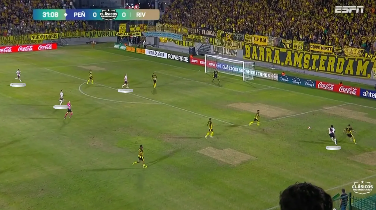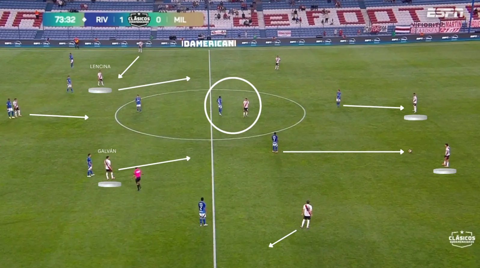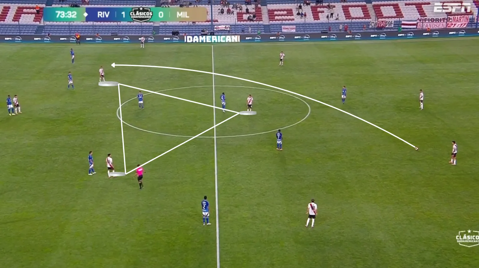 Esa estructura deriva en un juego más directo que controlador. Frente a rivales compactos y con presión, River lateraliza o divide la pelota. Contra bloques medios la tendencia se mantiene, aunque con algo más de circulación interior.