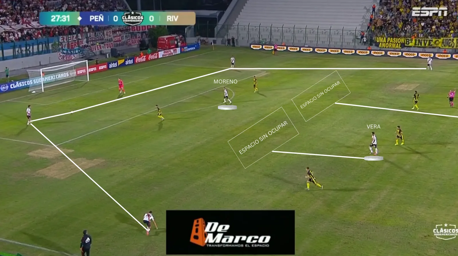La posición más determinante del campo mostró ajustes. Aníbal Moreno cayó reiteradamente a la primera línea para recibir, sobre todo ante bloques altos. Un movimiento habitual en su etapa en Palmeiras, desde donde logró ordenar la salida y dar claridad en la primera fase.