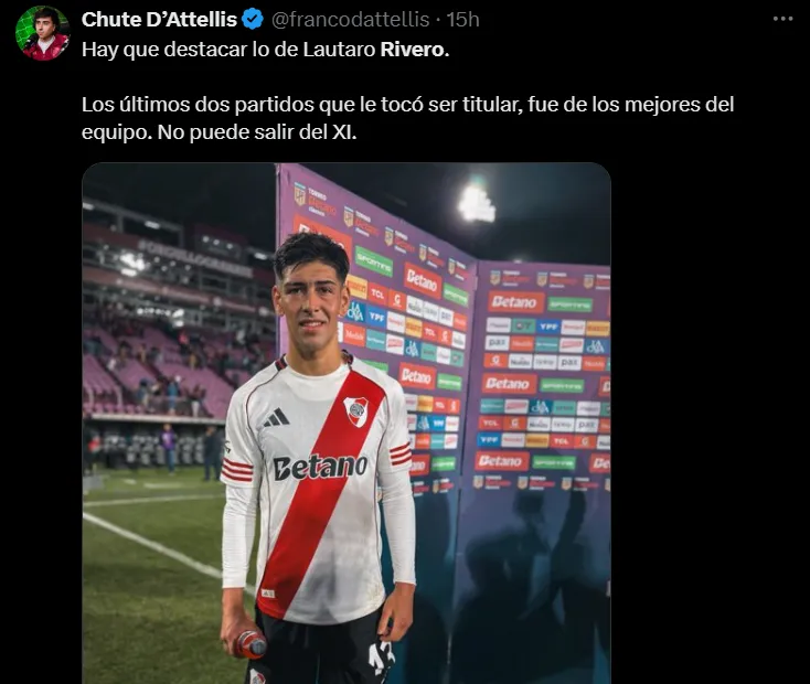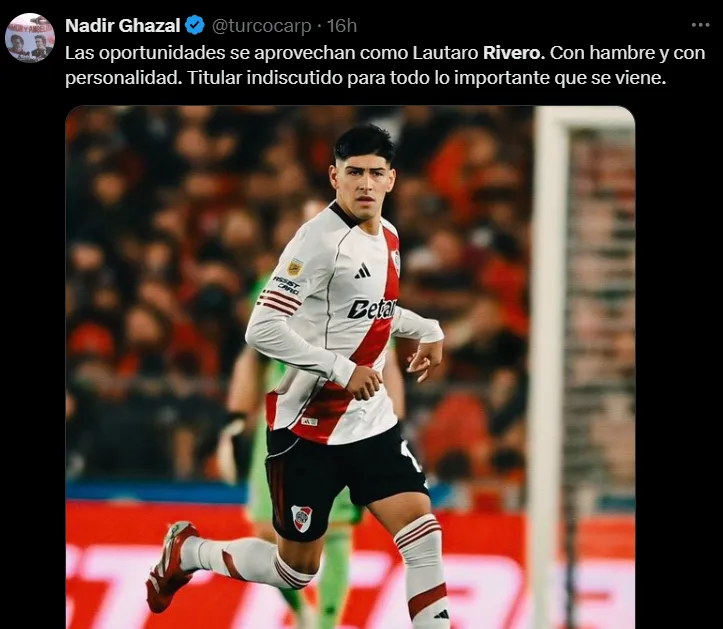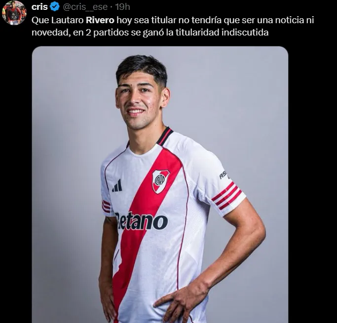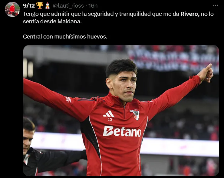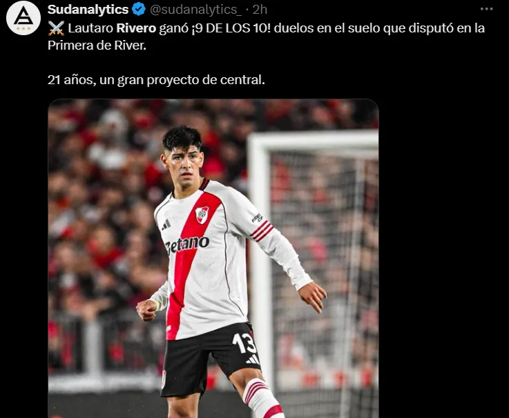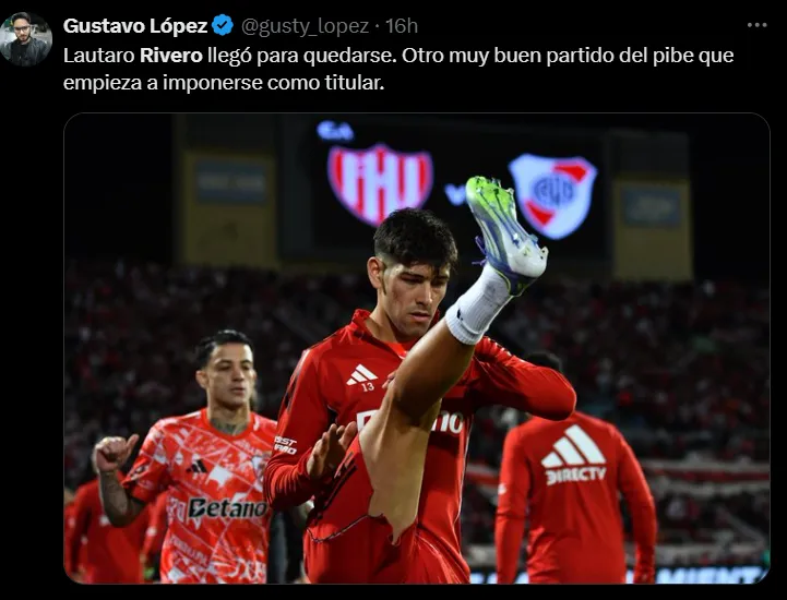 El juvenil, que regresó desde Central Córdoba en el último mercado de pases, fue una de las figuras del Millonario en la noche copera. Su rendimiento generó que muchos hinchas pidan que el Muñeco lo considere por encima de Lucas Martínez Quarta en la Copa Libertadores.