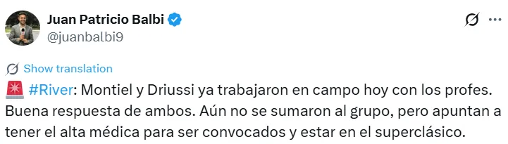 Vale recordar que Montiel sufrió un esguince leve en el ligamento de su rodilla derecha durante una práctica realizada la semana pasada, razón por la que no jugó el partido contra Gimnasia. Driussi, en tanto, no suma minutos desde el pasado 24 de octubre, cuando lamentó una distensión en el isquiotibial de la pierna izquierda en la eliminación de Copa Argentina contra Independiente Rivadavia.