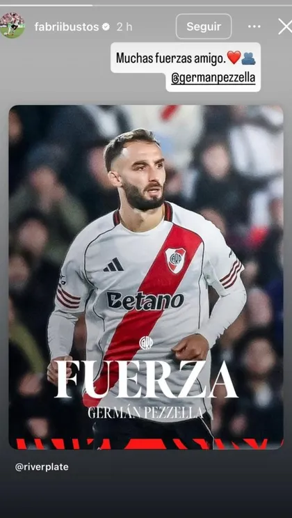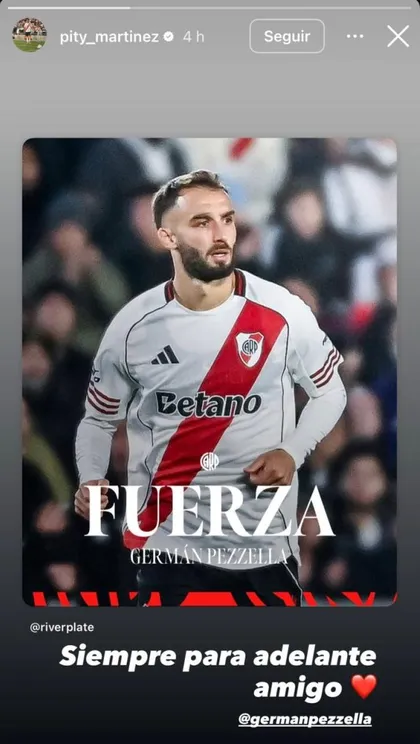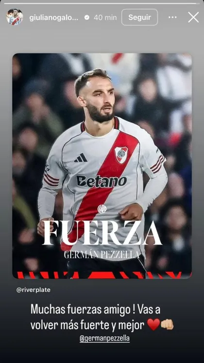 “Muchas fuerzas amigo, vas a volver más fuerte y mejor”, fueron las palabras de Giuliano Galoppo. A su vez, Fabricio Bustos, Agustín Ruberto y Matías Kranevitter le desearon “fuerzas”. El Pity Martínez tampoco se quedó afuera de los saludos y escribió “siempre para adelante amigo”.