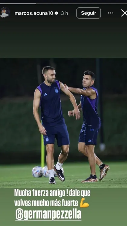 Por su parte, el Huevo Acuña compartió una imagen de ambos en un entrenamiento con la Selección Argentina para desearle una pronta recuperación a Pezzella. “Mucha fuerza amigo! Dale que volves mucho más fuerte”, escribió Marcos. River es familia, y lo sucedido con el defensor vuelve a dejarlo en evidencia.